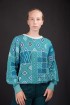 This sweater features an all-over geometric patchwork design for a bold, artistic statement. Diamond, stripe, and grid motifs are arranged like a woven quilt across the front and sleeves, with layered tones of teal, turquoise, and deep blue creating strong depth and visual interest. The relaxed silhouette, dropped shoulders, and softly gathered cuffs give it a casual, slouchy feel that still looks put-together.
