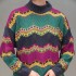 This sweater features bold chevron-style stripes and openwork lace details for a lively, vintage-inspired look. Deep charcoal is mixed with vibrant teal, magenta, and mustard yellow bands, creating strong contrast and a playful rhythm across the body and sleeves. The textured knit adds depth and dimension, making the pattern stand out while still feeling cozy and wearable.