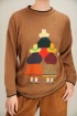 This cozy sweater features a warm camel-brown base with a charming intarsia-style figure motif on the front, creating a playful, artistic look with a subtle vintage feel. The simple crew neckline and clean contrast edging at the collar, cuffs, and hem add definition while keeping the overall design easy to wear.
