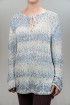 This sweater has a relaxed tunic silhouette with an all-over speckled knit that softly blends shades of blue and cream. The pattern fades gently from top to bottom, giving a light, ombré effect reminiscent of sea spray or a watercolor wash. A rounded neckline with a front slit and tie detail adds a casual, boho touch, making it easy to wear on its own or layered over a tee.